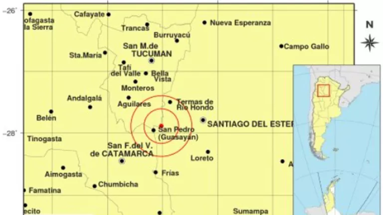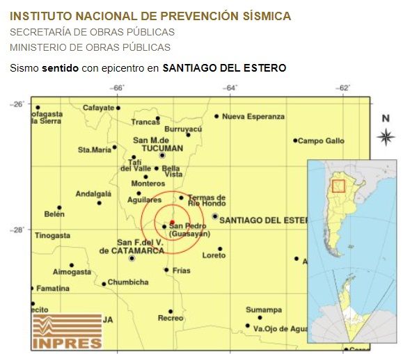 De acuerdo con la información suministrada por el Instituto Nacional de Prevención Sísmica (Inpres), sucedió a la 00:58:27 y tuvo su epicentro 76 km al oeste de Santiago Del Estero; 94 km al noreste de San Fernando del Valle de Catamarca; y 15 km al noreste de San Pedro de Guasayán.